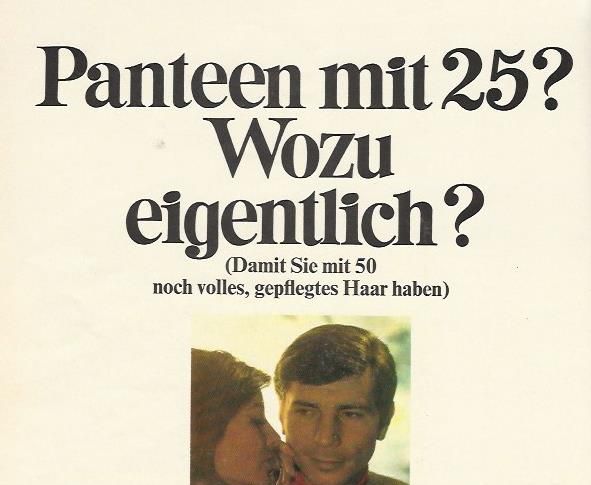 Anzeige 1967: PANTEEN – Vitamin Haarwasser – erfolgreich in 116 Ländern Redaktion vor 9 Jahren Eine jüngere Zielgruppe für PANTEEN soll mit dieser Anzeige aus dem Jahr 1967 angesprochen werden. Das gelingt über das Schreckgespenst Haarausfall.