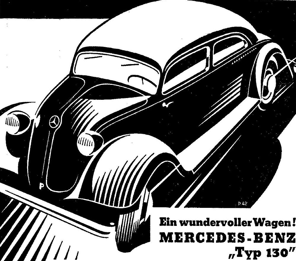 1934 schaltete Mercedes-Benz Anzeigen für den auf der Internationalen Auto- und Motorradausstellung (IAMA) in Berlin vorgestellten ersten Heckmotorwagen Typ 130 (internes Kürzel W 23). Dieses Fahrzeug mit damals modernen Doppelschwingachsen, Schnellgang, Zentralschmierung und Öldruckbremse sollte eine Art „Volkswagen“ sein, den sich jeder leisten kann. So nennt ihn Mercedes auch selbst in der Anzeige einen „billigen Wagen“.